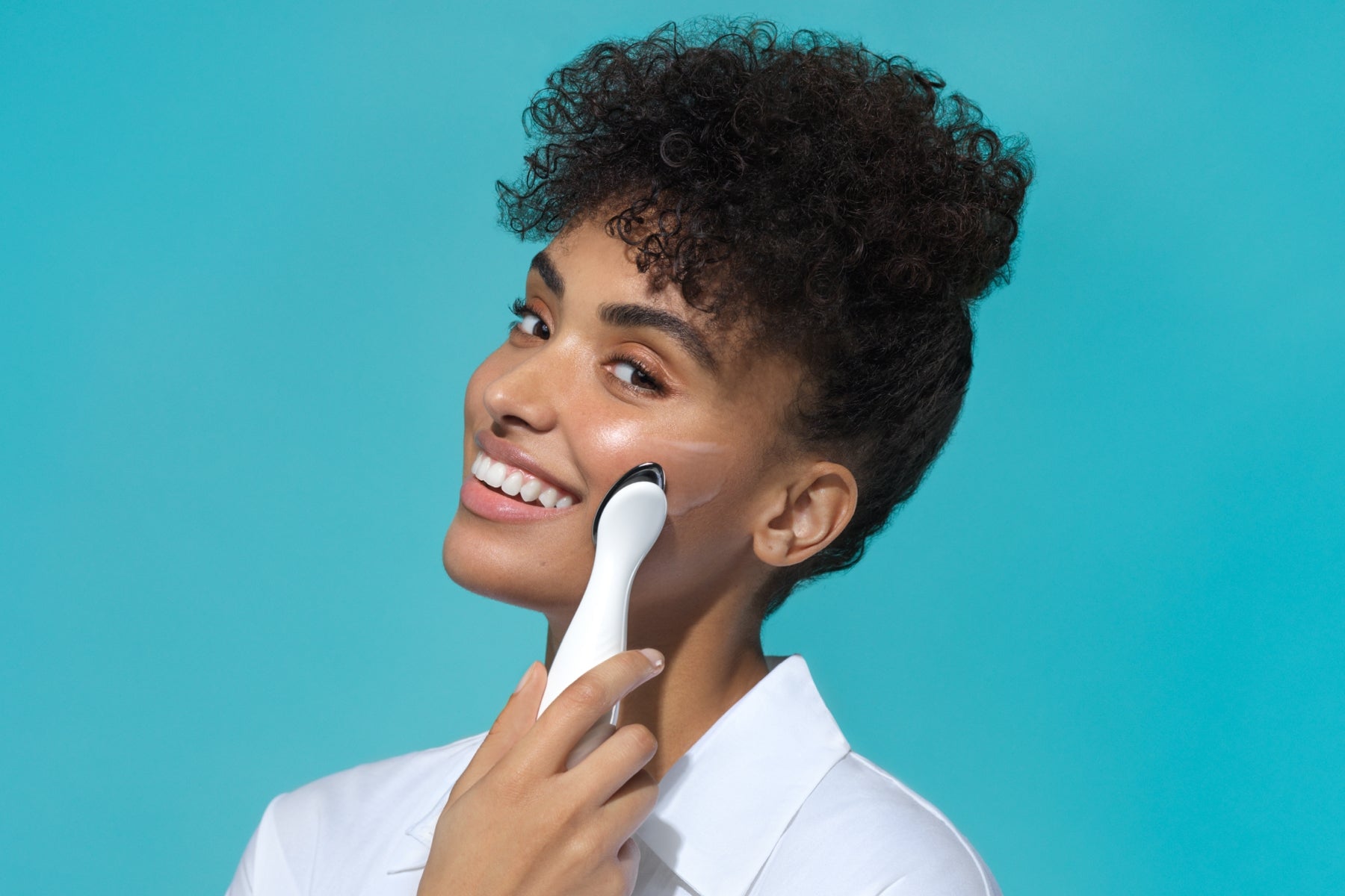 Dispense three pumps of ageLOC Boost Activating Serum onto the device’s conductive surface. Spread over one half of the face.